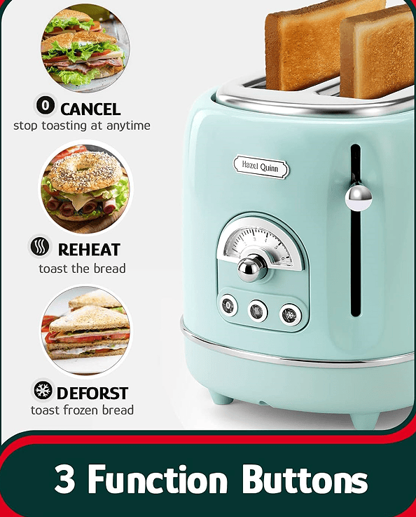 [2 slice Toaster and 3 Features] -The Hazel Quinn 2 slice vintage Toaster lets you easily bake one or two slices of bread at a time. In addition, with three practical features, you can choose to cancel, thaw, and reheat your toast.