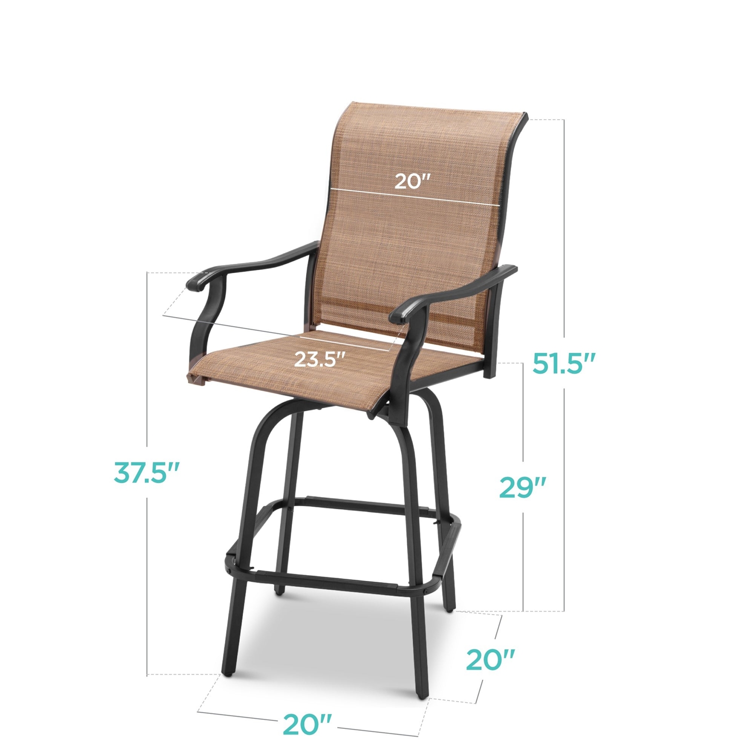 Smooth bearings in a classic rotating platform design let you freely turn and partake in the conversations all around you with this Set of 2 Tan All-Weather Mesh Swivel Barstools. High-quality powder-coated steel overlaid with textilene mesh creates an attractive, UV- and weather-resistant surface built to last. The steel frame includes a built-in support bar/ footrest for your comfort while breathable fabric. These chairs are built to be level with most bars and come with a wide seat and armrests for hours of seated relaxation