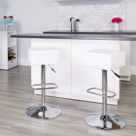This Set of 2 Backless Square Swivel Barstool with White Vinyl Seat is a swivel chair with a sturdy chrome frame base and 6.5 inches of thick foam padding . The stool is height adjustable.