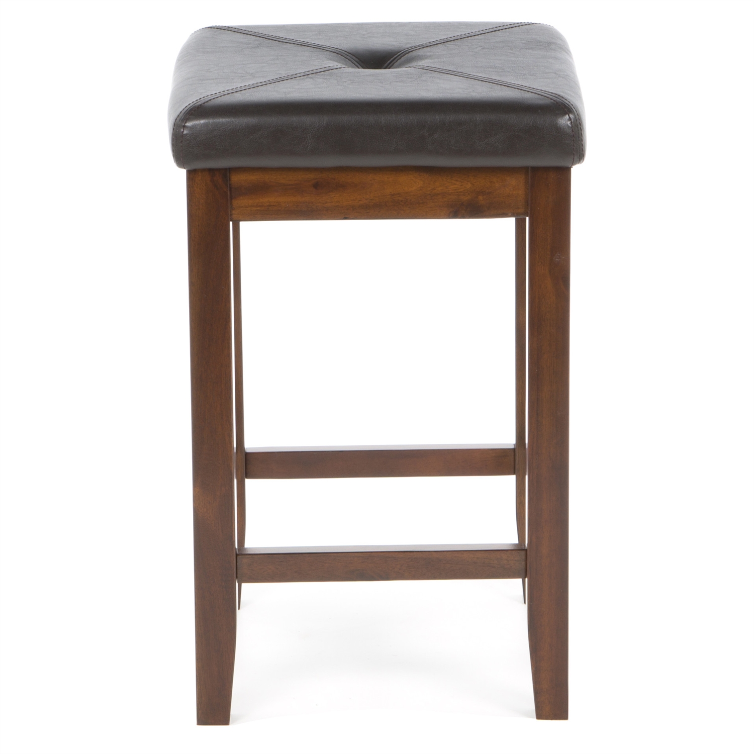 Comfort and style combined. This Set of 2 - Vintage Mahogany Bar Stools with Faux Leather Cushion Seat features solid hardwood construction. The cushioned seat is upholstered in simulated leather, that is stain and spill resistant.