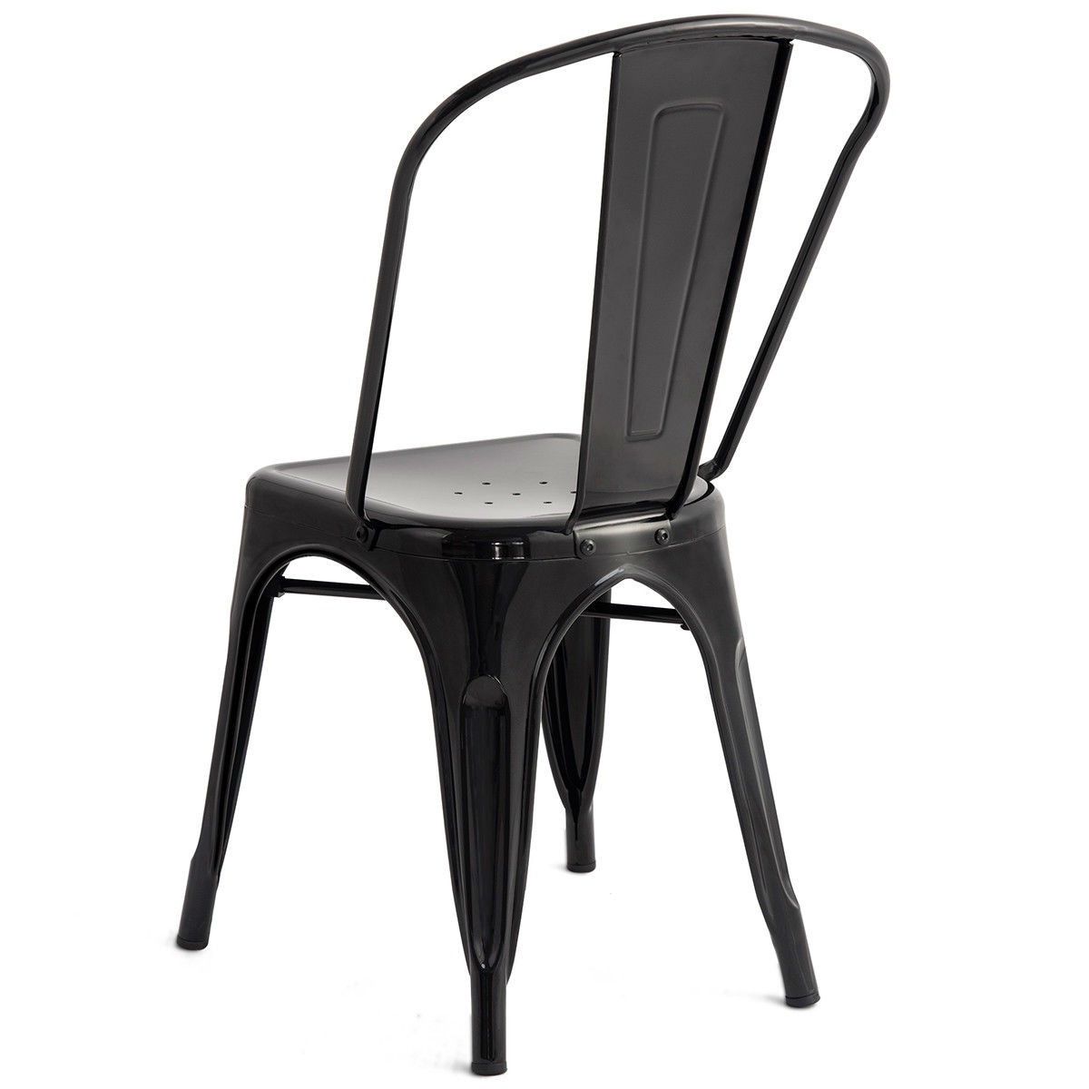 A classic touch is added to your kitchen decor with this Set of 4 Indoor Outdoor Black Metal Stacking Bistro Dining Chairs. Each chair features a high back which offers durable support needed down the center of your spine to help guard against fatigue and aches. Simple and practical, you can apply the set of chair into anywhere you can imagine, such as bistro, living room, dining room and your kitchen.