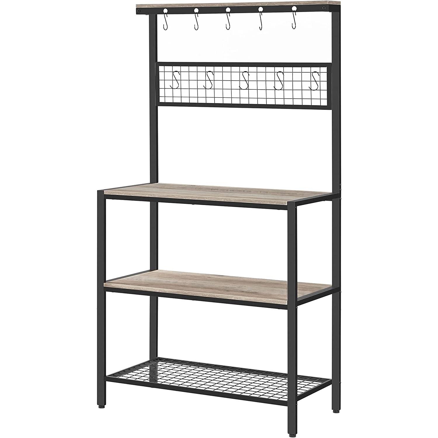 Modern 3-Shelf Black Metal Light Grey Wood Kitchen Baker's Rack Microwave Stand