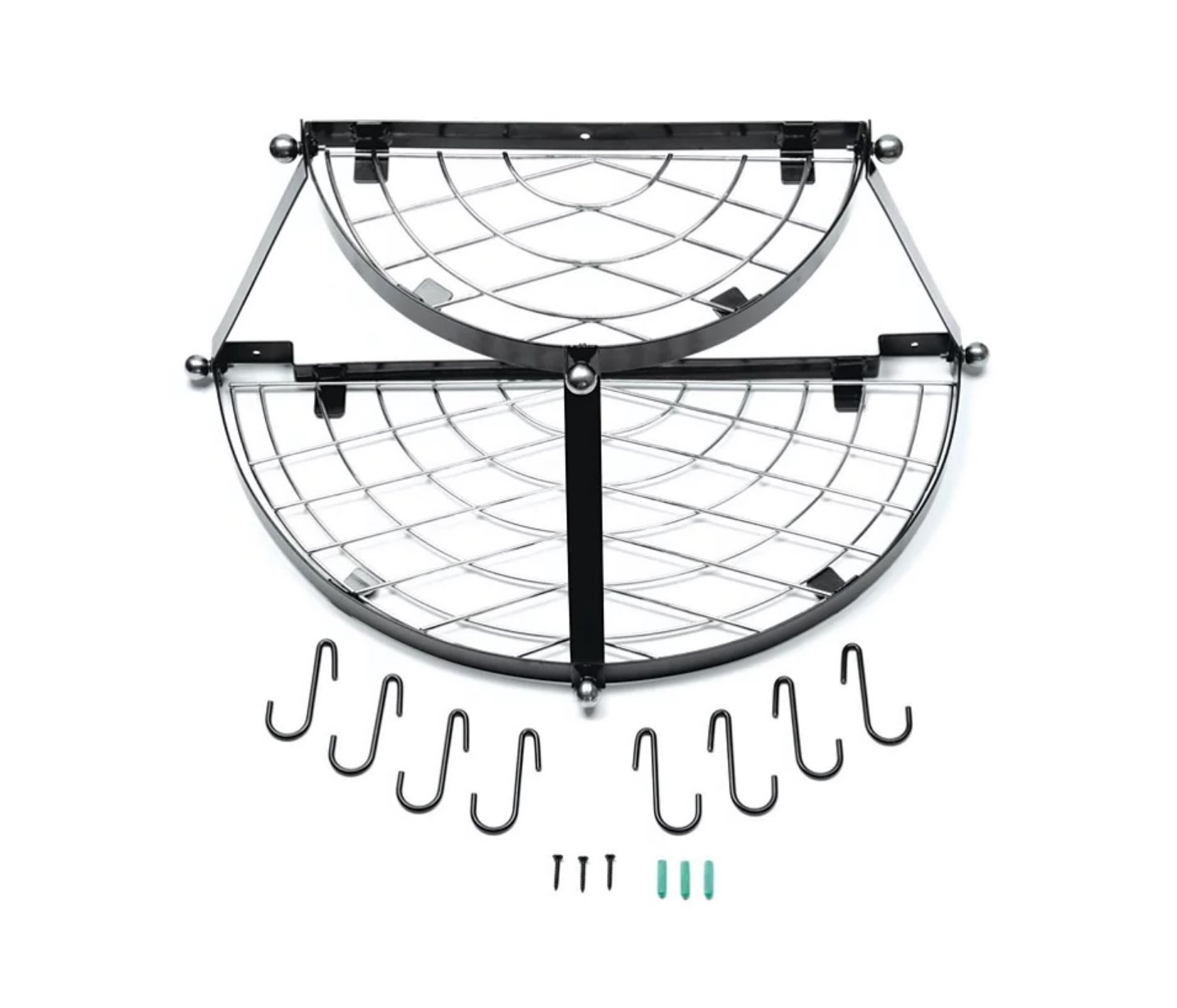 Arrange your cookware and utensils with this Modern Wall Mounted Enameled Double Shelf Pot Rack in Black. Easily access your hanging cookware and utensils with this wall-mounted rack! This attractive pot rack features upper shelf and repositionable hooks to maximize your space. You can hang over the stovetop, sink, kitchen island or any other desired area in your kitchen. Maximize your space with this stylish hanging rack, as seen in designer home magazines! Easy to assemble and install, the Black Enameled Wall-Mounted Pot Rack comes with complete hardware for installation.
