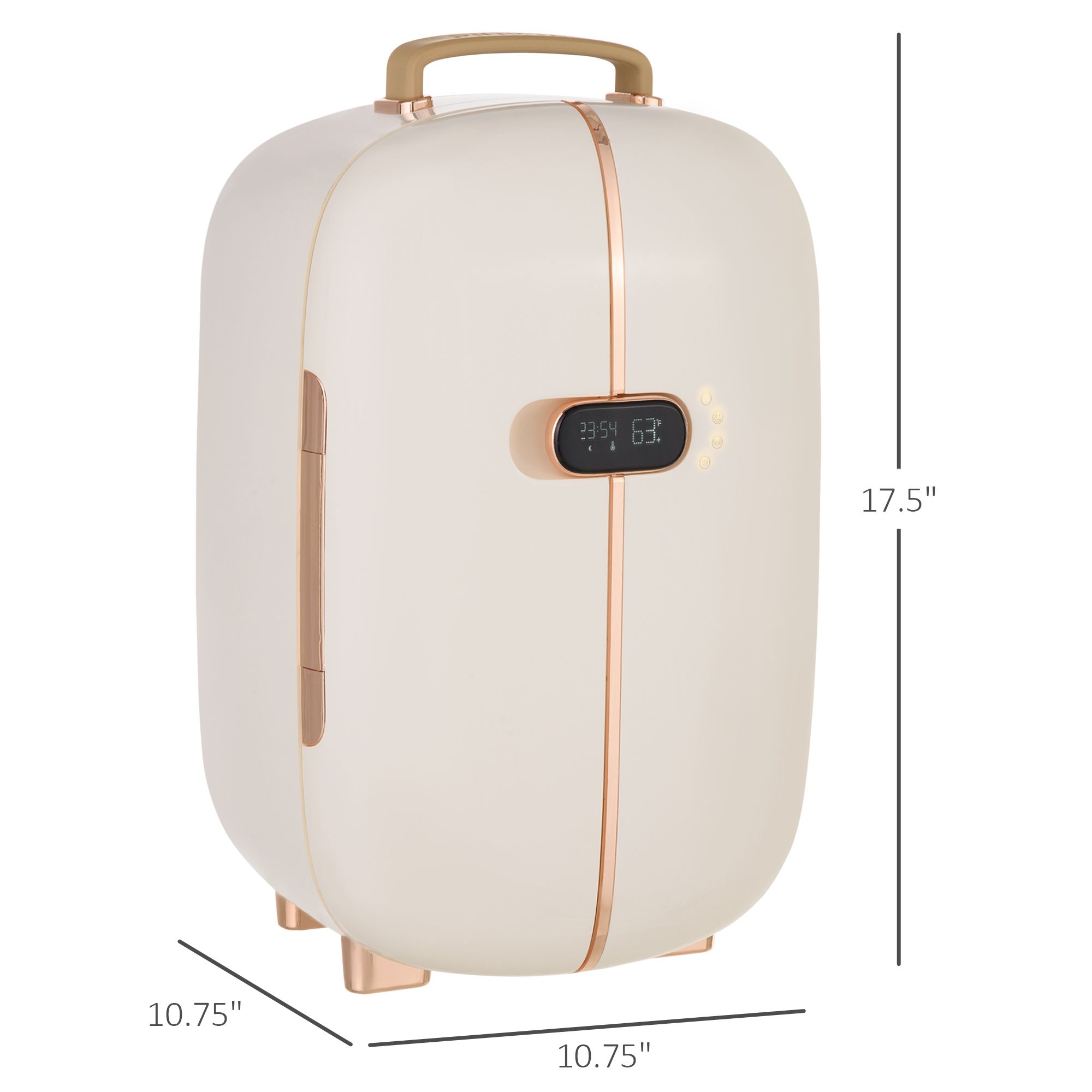 LED Display: Our makeup refrigerator with LED screen conveniently displays operating hours and temperature, allowing easy switching between Fahrenheit and Celsius for clear visibility. Overall Dimensions: 10.75" L x 10.75" W x 17.5" H. Inside Dimensions: 10" W x 9.25" D x 16.5" H.