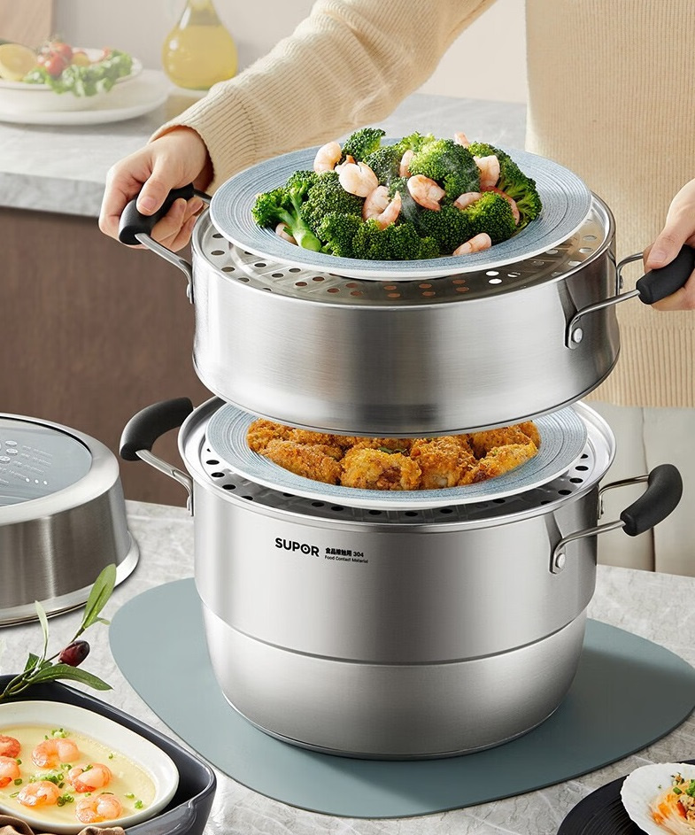 1.1.Shallow steaming compartment, easy to put and take, to prevent scalding, infusion design, food is fresh and not easy to string flavour, three layers of large capacity, at will combination, stacking storage, save kitchen space.