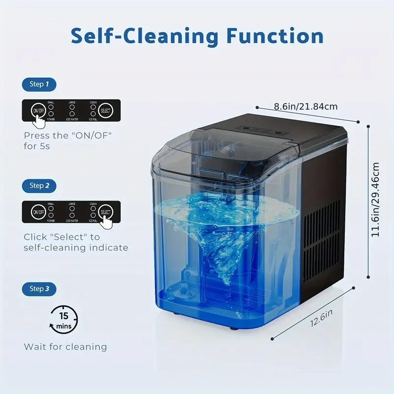 Equipped with a convenient carrying handle, it's perfect for camping trips, backyard BBQs, RV adventures, or patio parties. Its built-in self-cleaning system helps maintain hygiene with minimal effort, while the low-noise operation guarantees a peaceful environment. Whether you're entertaining guests or just cooling down on a summer day, this ice maker is your go-to solution. Includes an ice scoop for added convenience.