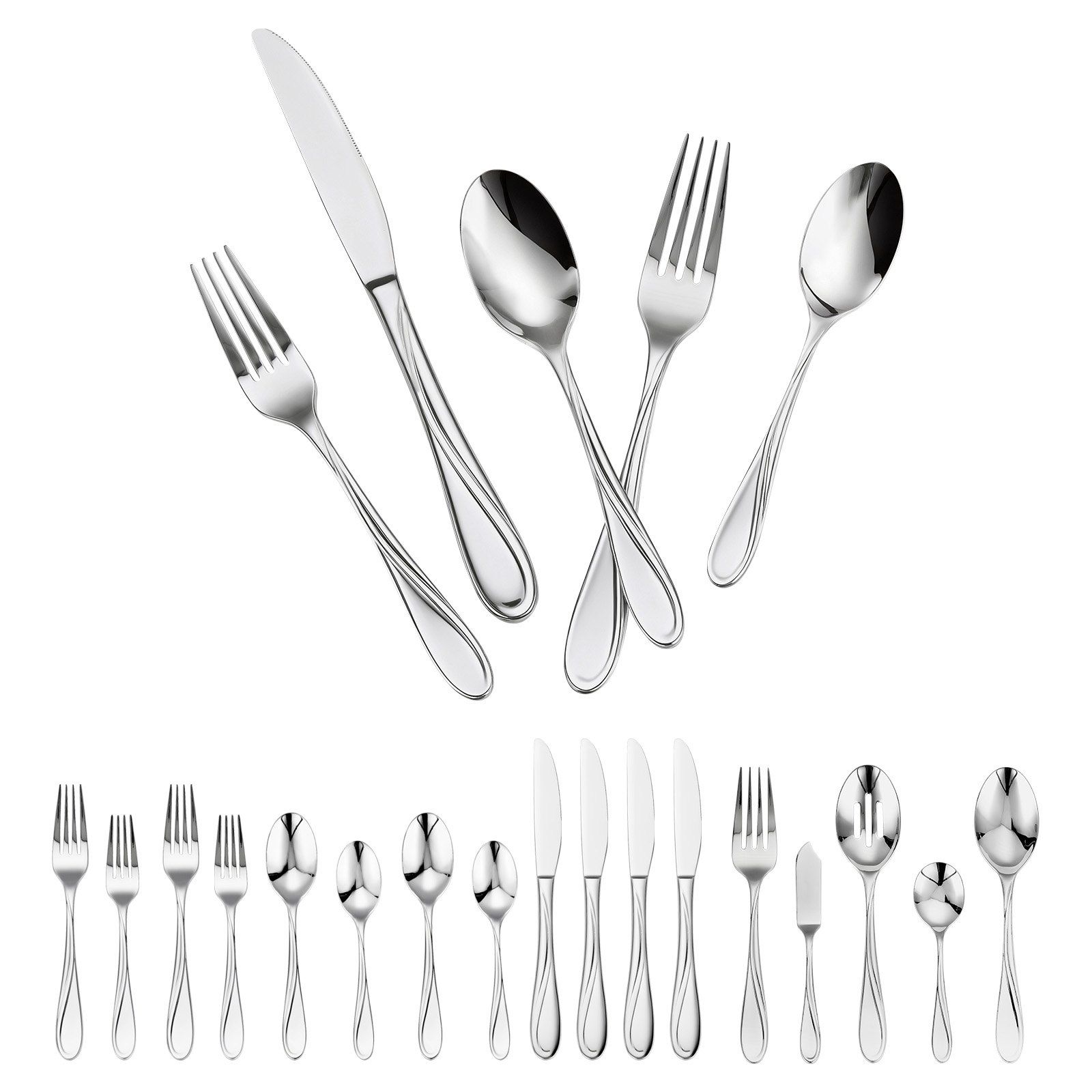 This set features a combination of 2 spoon types, 2 fork types, 1 knife type, and 1 service Set, including dessert spoons, dinner spoons, dinner knives, dessert forks, dinner forks, serving fork, serving spoon, sugar spoon, butter knife, and sieve to meet your everyday dining needs.